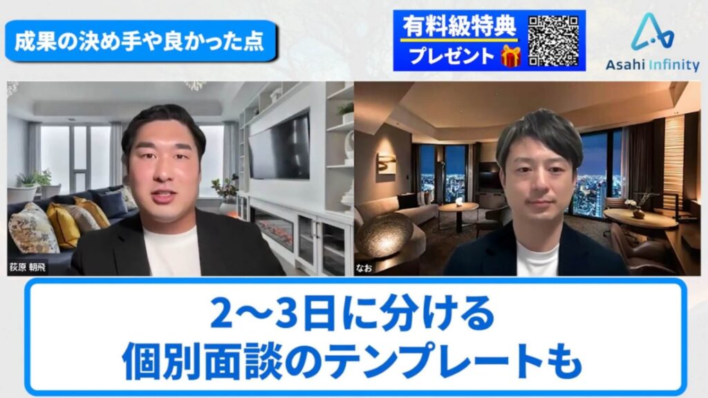 なお:そうなんです。しかも実際にあさひさんが使っているロープレ(営業トーク)も共有していただいて、どのタイミングで何を言うかまで明確でした。初心者でもこのとおりやれば絶対成果出るなと思いました。