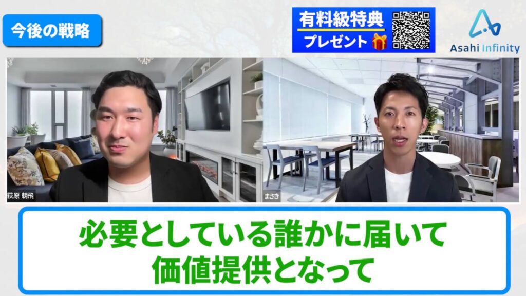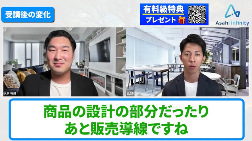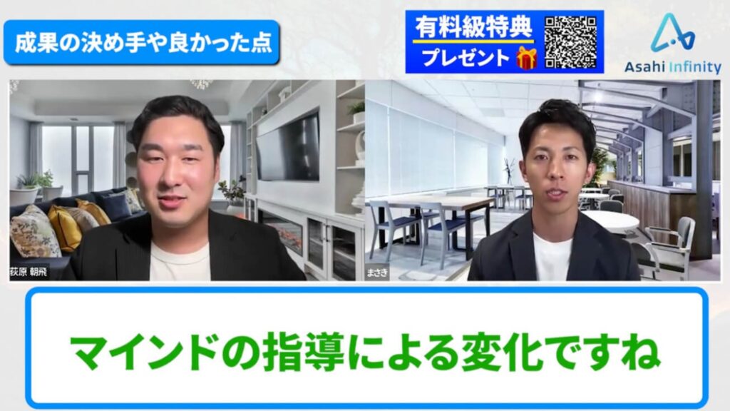 まさき:すごいのが、あさひさんが今も学び続けていることです。最新のAIコンテンツやメタ広告、今まさに必要とされるマーケティングを学んで、それをすぐ受講生にシェアしてくれる。だから学びがどんどんアップデートされていくんです。