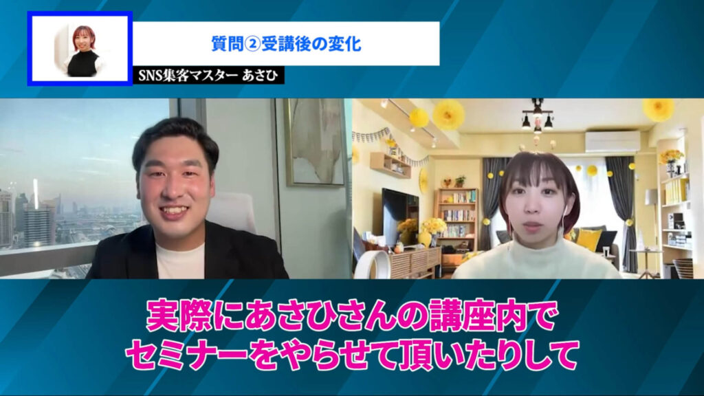 あさひ:素晴らしいですね!実際に、僕の講座内でセミナーもしていただきましたよね?