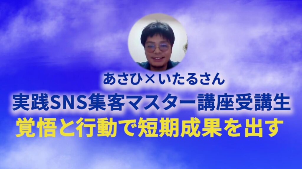 あさひ:今回は、実践SNS集客マスター講座を受講された中村いたるさんにお越しいただきました。本日はよろしくお願いします。