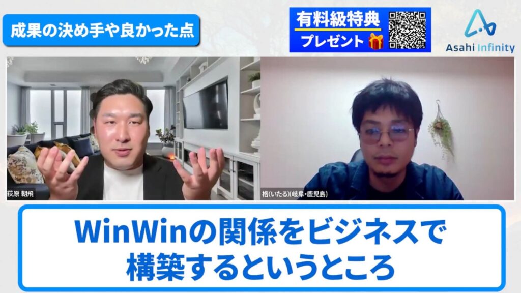 あさひ:そこから、実際にセールスを始めて成果が出るまでのスピードがとても早かったと思うんですが、何が一番助けになりましたか?