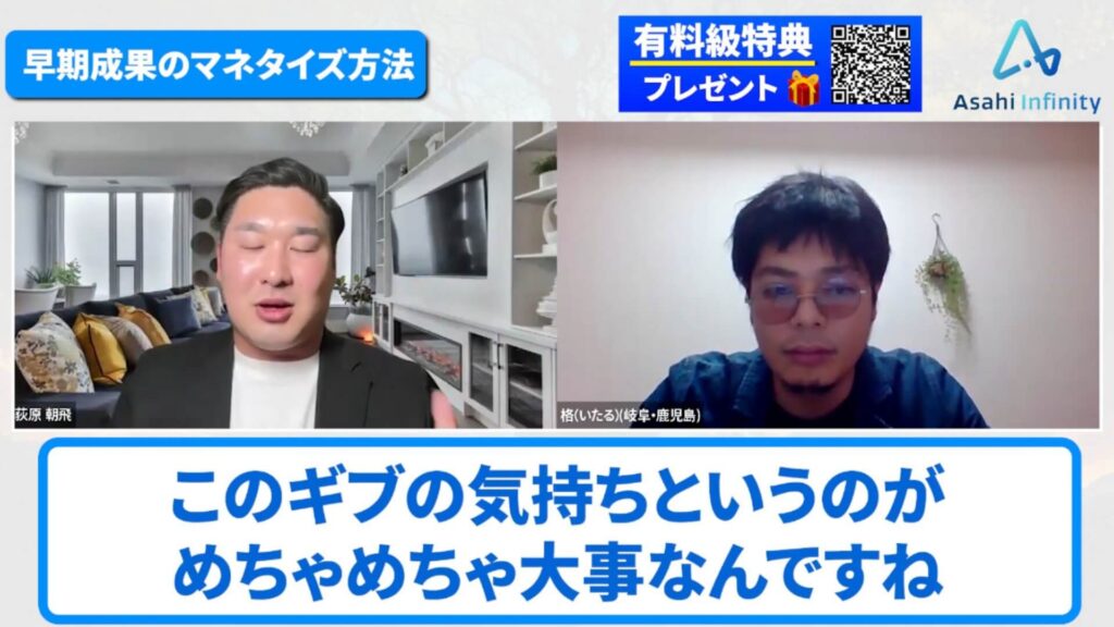 あさひ:本当に大事な考え方で「まずは与える」。これができる人は、間違いなく成果を出します。世のなかの多くの人は「どう売るか」「どう取るか」ばかり考えがちなんです。でもいたるさんは違って「まず目の前の人を救いたい」っていう姿勢が最初からあったからこそ、信頼も成果もついてきたんですよね。