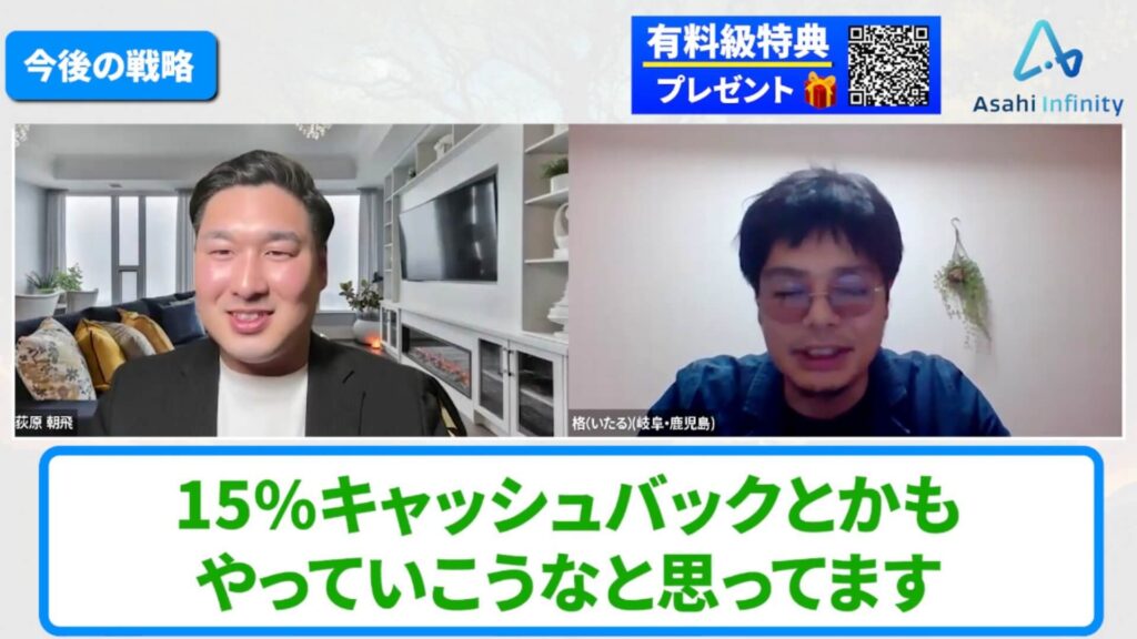 いたる:まず、既存のお客様からの口コミを最大限に活かしたいと考えています。実際に「紹介したい」と言ってくださる企業様がいらっしゃったので、その動きをもっと広げていくために、紹介してくださった方には15%のキャッシュバックをお渡しする仕組みを導入しようと思っています。