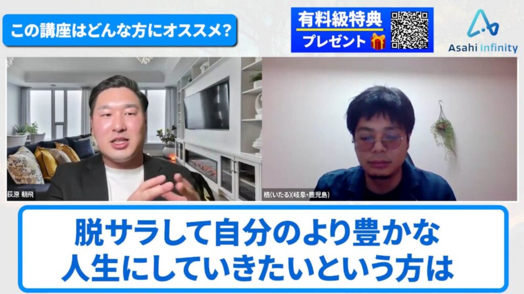 あさひ:最後に恒例の質問なんですが、僕の講座やコンサルって、どんな方におすすめですか?