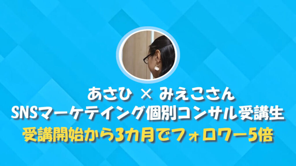 あさひ:皆さんこんにちはあさひです。今回は、SNSマーケティング × 個別コンサルティング受講生のみえこさんに来ていただきました。本日はよろしくお願いします。