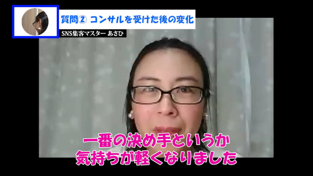 あさひ:それでは3つ目の質問にいきますね。変化の決め手になったもの、そして僕のコンサルのなかでよかったと思ったポイントがあれば教えてください。