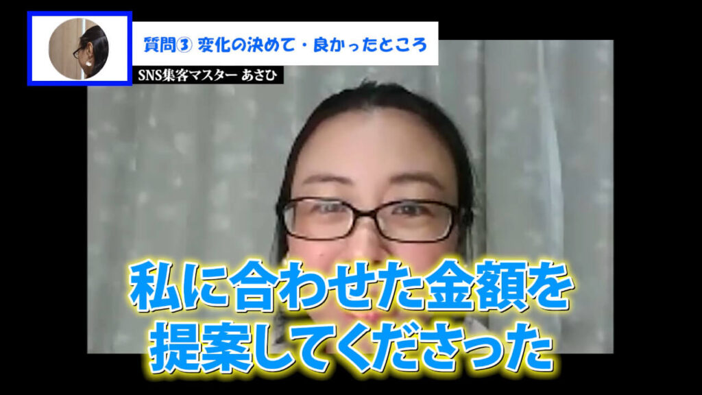 あさひ:ありがとうございます。僕自身、テンプレだけで進める指導はあまり好きじゃなくて「この人の場合だったらどうすれば現実的に動けるのか」を大事にしています。だから、みえこさんの場合も「今の自信で出せる金額」を起点に提案を組み立てていったんですよね。