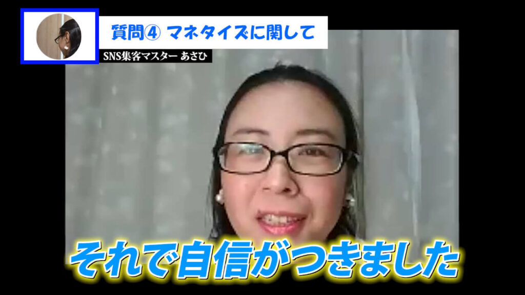 あさひ:それでは4つ目の質問です。みえこさんは0 → 1を達成されたということですが、実際にどのようにマネタイズされたのか教えていただけますか?