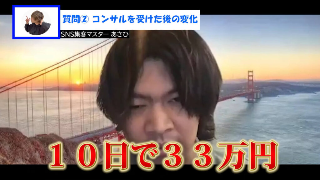なおき:もともとオンラインサロンに力を入れていたんですが、単価が安くて「これだけか……」みたいに思っていたんです。でも、あさひさんのアドバイスどおりに高単価の商品設計を取り入れたら、10日で33万円、1か月で66万円を達成することができました。