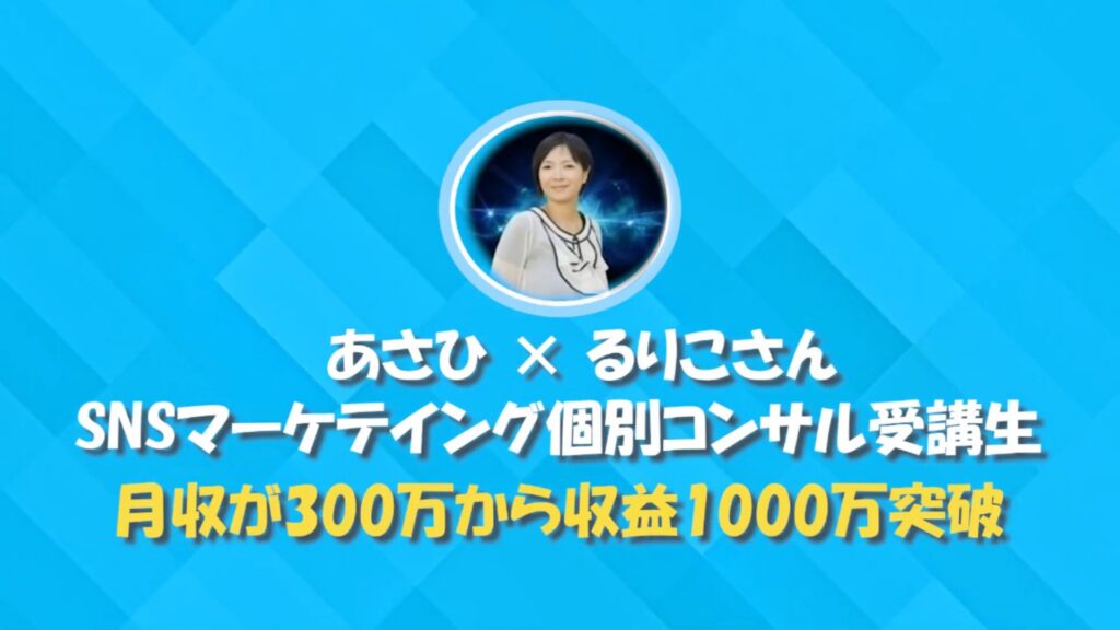 今回の主人公は、4人の子育てをしながら起業コンサルタントとして活動するるりこさん。受講前は最高月収300万円でしたが、講座受講後わずか1か月で売上を倍増し、ついに月収1,000万円を達成しました。