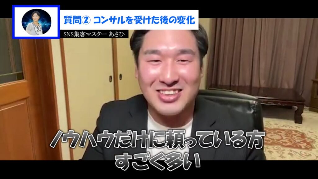 成果を出すためには、クライアントとの相性が非常に重要です。あさひのコンサルは、目標達成に向けて熱量を持って伴走するスタイルと、受講生を信じ切る姿勢が特徴。論理と感情の両面からサポートするため、特に女性起業家や「自分を変えたい」と思っている人に響きやすい傾向があります