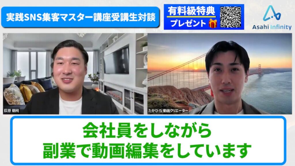 あさひ:なるほど。たしかに副業として始めるには、事業の選択がものすごく重要ですよね。僕も常々「どんなジャンルを選ぶかで成功が決まる」と伝えていますが、そういった意味でも動画編集を選んだのは大正解だったと思います。