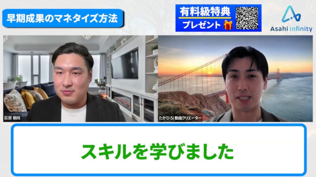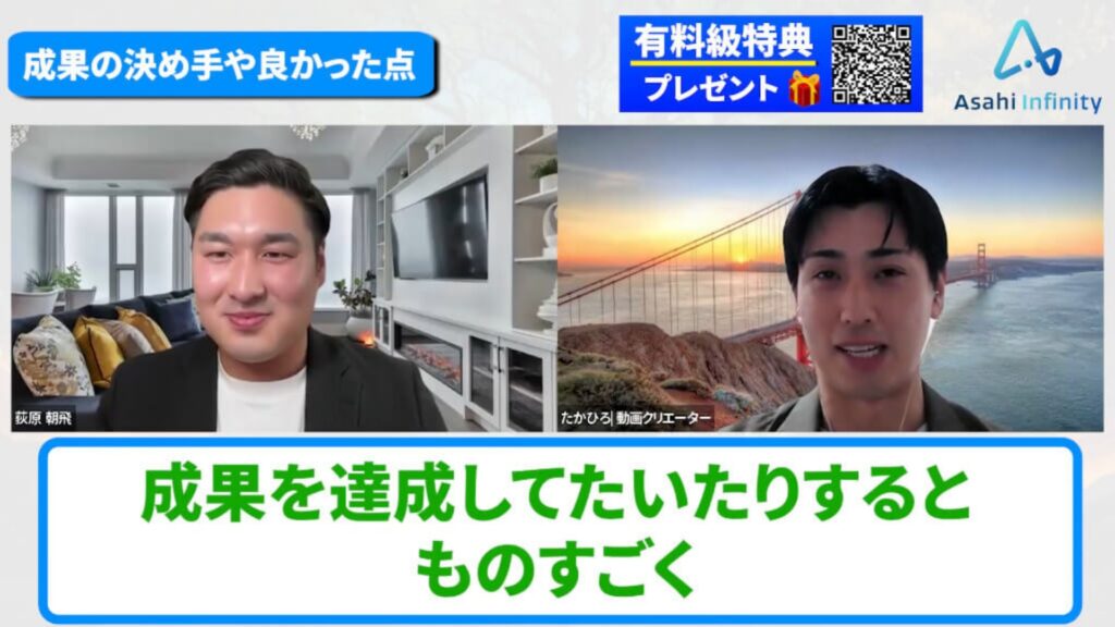 たかひろ:あさひさんが今も現役で成果を出し続けているところに、ものすごく信頼を感じました。ほかの講座だと、講師は表に出ずにマネージャーだけで対応しているケースもありますが、あさひさんは自ら最前線で実践していたことが一番の説得力でした。