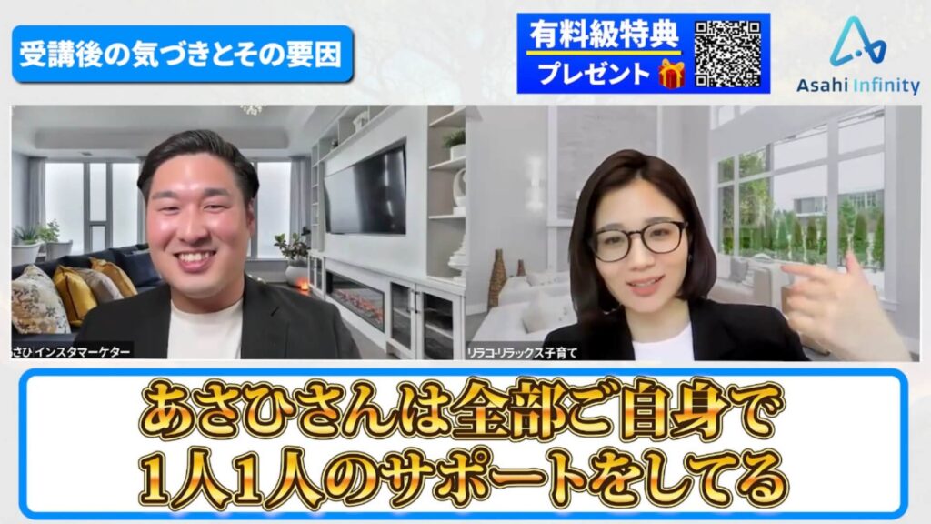 りらこ:もう、一番は「あさひさんが全部1人でサポートしてくれる」ってところです。講座って人数が増えてくるとサポート講師が間に入って、結局トップの人から学べない……ってこと多いんですよ。