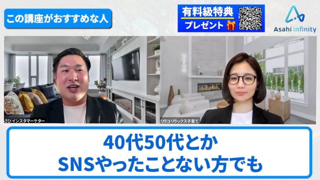 りらこ:そうですね、まずは「SNS初心者」の方。私自身マーケティングもパソコンも苦手だったんですけど、そんな私でも成果が出たので、初心者こそおすすめです。でも、実際には売上をもっと伸ばしたい中級者・上級者の方も多く受講されています。