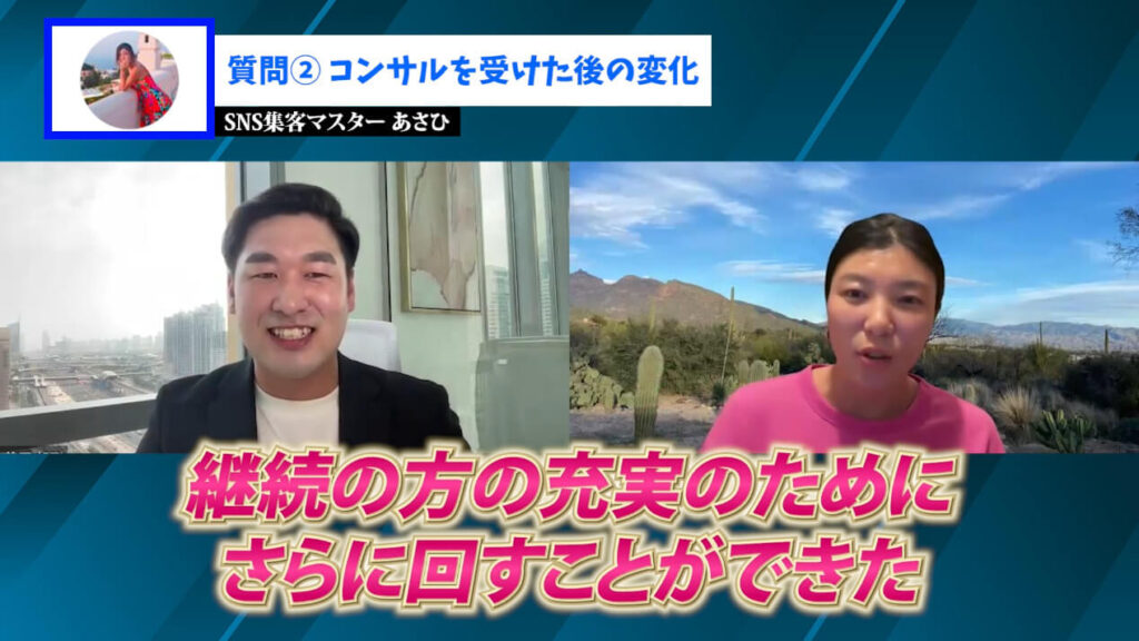ここまでの実績を出したよしみさんが最後に語ってくれたのは「このコンサルはどんな人にこそ合うのか」という視点です。自身の体験を通じて感じたあさひのコンサルの特長と魅力を、ストレートに語っていただきました。