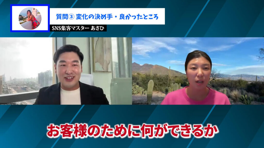 よしみ:あさひさんに「無料相談は売る場ではなくて、相手のために全力で価値を届ける場だよ」と言っていただいて、それを実践しました。