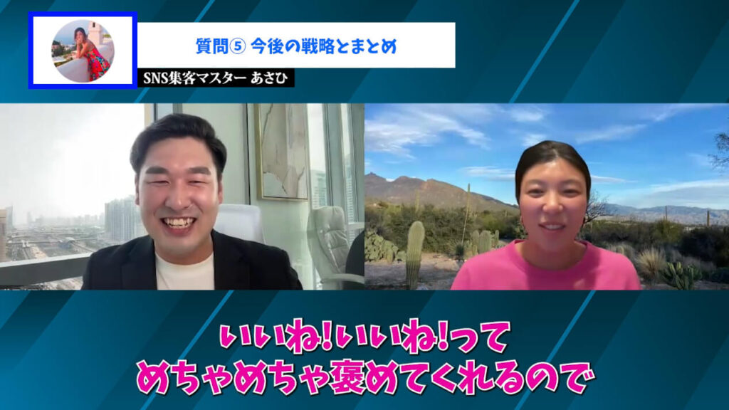よしみ:ほかのコンサルでは0 → 1だけとか、上級者向けだけというケースが多いんです。でもあさひさんはそのどちらも教えてくれるし、何より褒めて伸ばしてくださるんですよ。