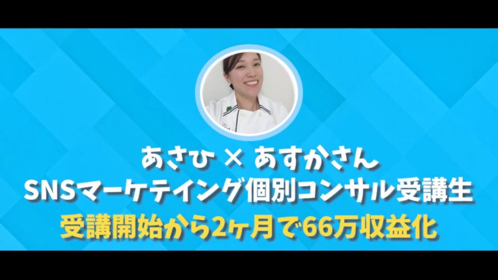 あすか:1か月目で25万円、2か月目で66万円を達成しました。やるべきことが明確になり、迷わず行動できました。