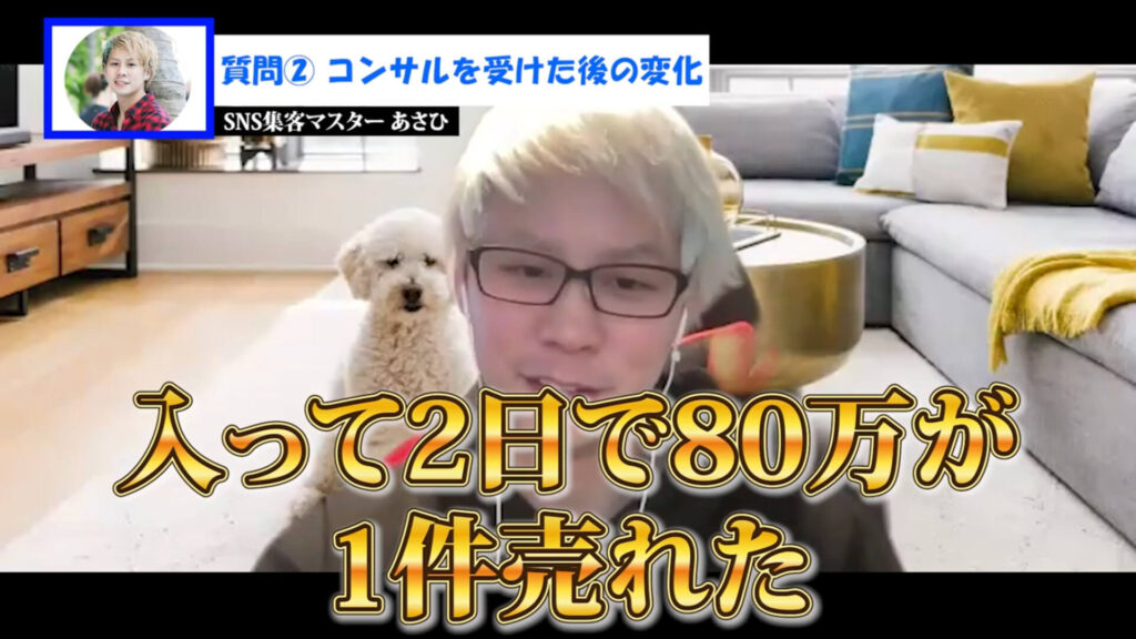 でも、あさひさんの講座を受けたことで、その悩みがブレイクスルーできました。コンサルを受けて2日で80万円の成約が取れたことは大きな変化でしたし、1か月で蓋を開けたら合計320万円の売上になっていて、本当に驚きました。