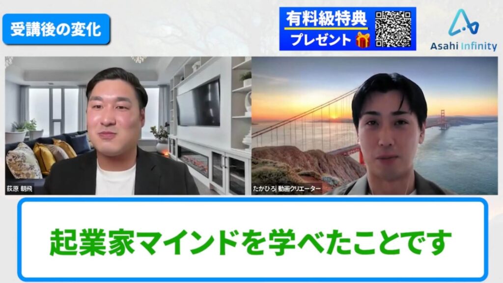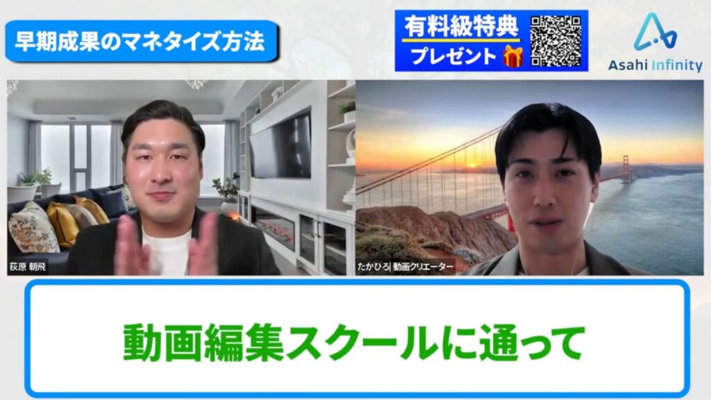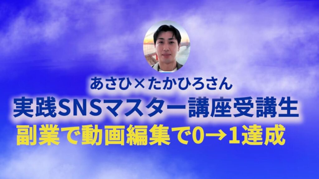 あさひ:すごい成長スピードですよね。僕の受講生でカッシーさんという方がいるのですが、その方の対談動画をたかひろさんが編集したことで実際に成約まで繋がったんですよね。