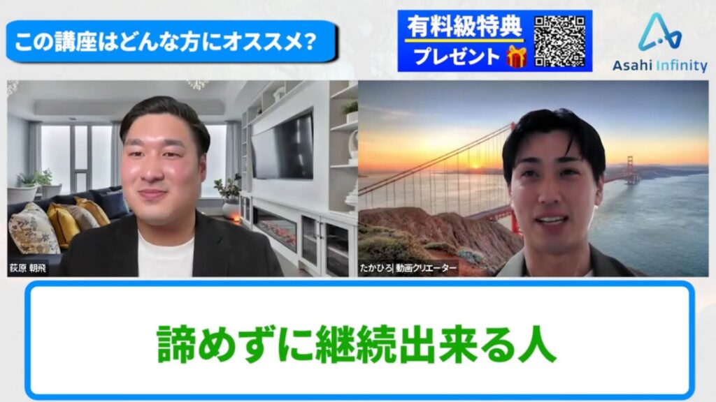 たかひろ:まず前提として、本業と同じように「成果や目標にコミットして、諦めずに継続できる人」には本当におすすめです。生涯年収を最大化したい人や、お金を稼いで実現したい目標がある人、人生を本気で変えたい人にはすごく合っていると思います。